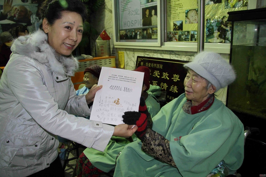 法制晚报讯 今天上午9时许,著名歌唱家关牧村来到松堂关怀医院,为这里的老人带来动听的歌声以及1万元,老人们用歪歪扭扭的签名贺卡回赠关牧村表示感谢。